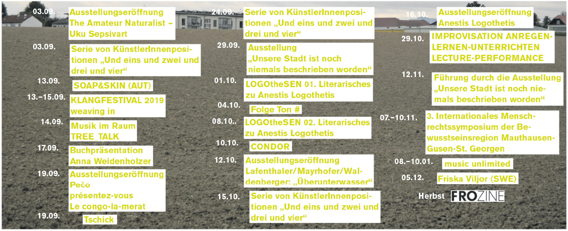 Die Redaktion hat für diese Ausgabe Tobias Eder, Wolfgang Fuchs, Marlene Gölz, Klaus Hollinetz, Jürgen Köglberger, Michaela Kramesch und Herbert Stöger um ihre Veranstaltungsempfehlungen gebeten. Vielen Dank!