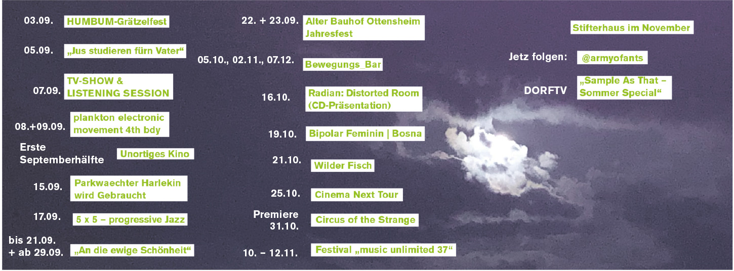 Der Spätsommer bringt’s: neben merklich kürzeren Tagen mit Sturm, Wind und Regen hier ein abwechslungsreicher Veranstaltungskalender mit ganz persönlichen Empfehlungen von Bibi Finster, Daniela Gutmann, Sonja Meller, Ralf Petersen, Mar Pilz und Vicy Schuster – Watch out!!
