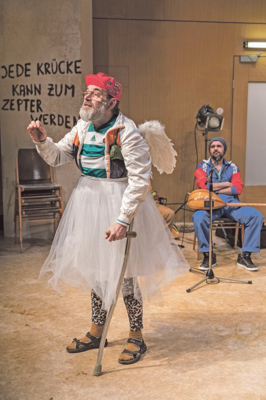 Episches Theater nach Brecht ist hier genauso drinnen wie Beckett, Flann O’Brien, klar, ist ja eh immer bei Palm dabei, aber: Handelt es sich hier eigentlich um ein Theaterstück? Oder einen Laienschelmenschwank? Eine zufällige Probe, von zufällig vorbeischauenden Probenden? Den Versuch einer Probe? Ist die DDR der hier auftretende Tod? Auf alle Fälle schimmert ein durchgängiger, jedoch disziplinierter Dilettantismus durch, alle drei Hauptdarsteller (solidarisch: gefühlt gleichlange Texte) erblühen in dieser von ihnen abverlangten Gratwanderung glaubhaft.
