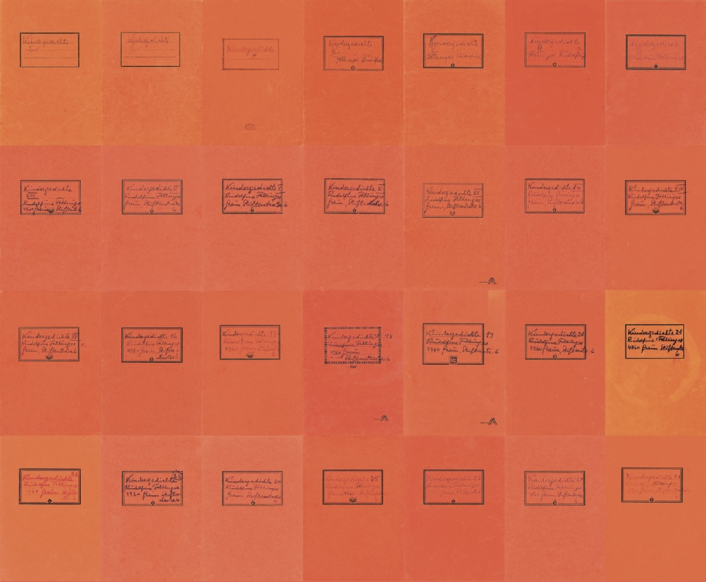 Neben ihrer Inszenierung vorhandenen Materials bringt Sarah Schlatter auch selbst geschaffene Arbeiten in diese Ausstellung ein. So hat sie in zwei Arbeiten Buchstabe um Buchstabe bis zur Unlesbarkeit übereinandergeschrieben. Dass sie sich dazu entschieden hat, bei dieser vielschichtigen Schau, die auf sehr unterschiedliche Quellen zurückgreift, auch noch die eigene Aktion als weiteres Element hinzuzufügen, kann man reizvoll finden. Für mich verlässt sie dadurch den Fokus ihrer Präsentation.