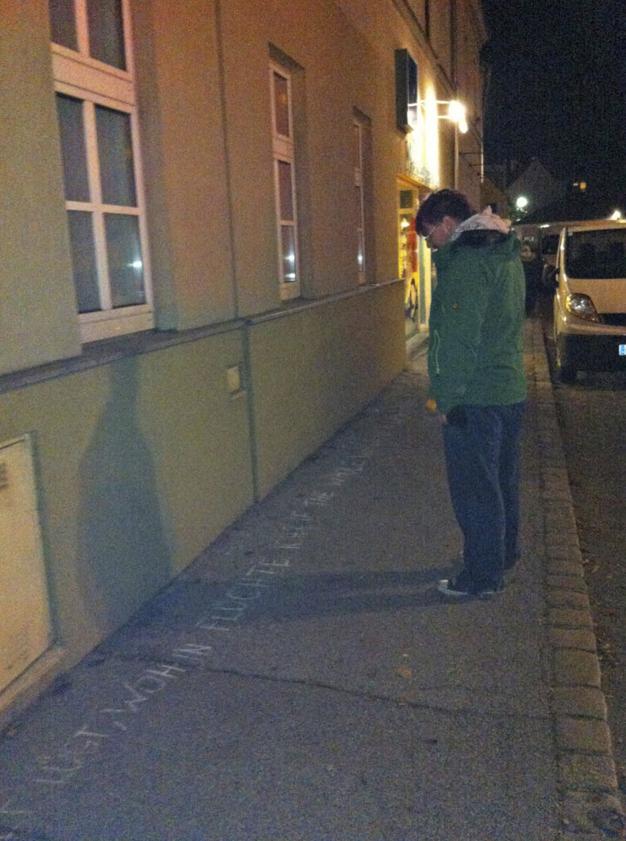 Um 18:30 Uhr geht sie zu einem ausgewählten Gehsteig zwischen Hauptplatz und Asylzentrum und schreibt ihre Frage in deutscher und englischer Sprache zwei Stunden lang als Endlosschleife auf den Boden. Zu Beginn sind kaum PassantInnen unterwegs. Während des Schreibens spürt sie die wenigen Vorbeigehenden. Sie spürt die Irritation, die sie auslöst. Die meisten weichen umgehend aus. Sobald der erste Satz geschrieben ist, versuchen einige der Leute, mit der Schreiberin ins Gespräch zu kommen. Doch diese überhört das Gesagte und schreibt unbeirrt weiter. Neben der Irritation, die sie auslöst und wahrnimmt, kommen nun auch Rückmeldungen hinzu. Oft hört sie zustimmende Worte wie „Schön“ von den PassantInnen. „Toll, was Sie hier machen“. Manche Personen regen sich auf: „Was macht denn die für einen Blödsinn da?“ „Ist dir fad?“ „Hat wohl nix zu arbeiten“.