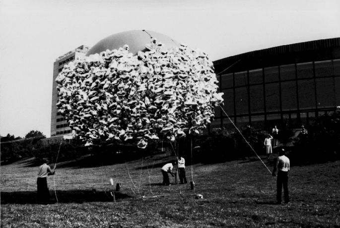 Herzballon vor dem Brucknerhaus, Donaulände 1979. Foto Publikation Stahlstadtschule