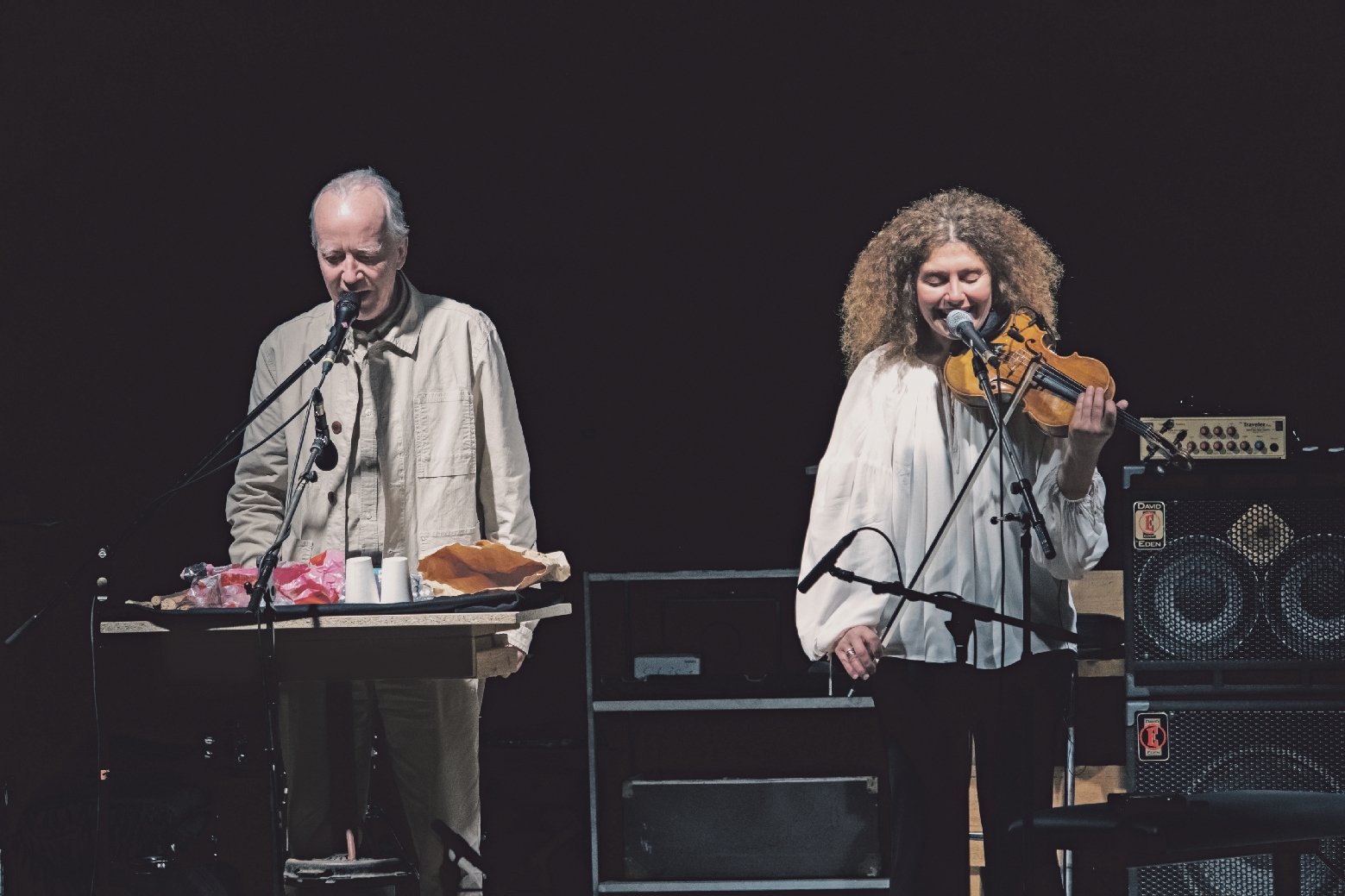 Es folgt Das ökologische Manifest, eine Improvisation mit Stimmen, Violine, Geräuschen. Dafür tritt Ablinger, der Komponist, auf die Bühne. „Peter“, erzählt mir Voutchkova später, „improvisiert eigentlich nie. Das ist wirklich eine Seltenheit.“ Sie erklärt mir, dass Das ökologische Manifest für Ablinger ein Stück ist, während es für sie eine Improvisation sei: „Es ist nicht wieder aufführbar, man müsste es imitieren. Das will niemand.“ Auf einem Tisch hat Ablinger Dinge versammelt, die er zur Klangerzeugung nutzen wird: Plastikfolie, eine Papiertüte, metallene Deckel, Wasserflaschen. Es beginnt damit, dass Ablinger Kugeln in der Hand aneinanderreibt, dass sie einen kreischenden Ton vermitteln. Voutchkova spielt und schabt auf der Violine, murmelt. „Beanstandung“, sagt Ablinger, „fallen lassen, gegebenfalls“, oder „Veränderung erzwingen können“. Es stellt sich das Gefühl ein, man oszilliere zwischen zwei Radio- oder gar Fernsehprogrammen. „Es enthält viele Informationen“, sagt Voutchkova mir, „aber es ist kein erzählendes Stück.“ Der Empfänger muss die Klangkulisse filtern und sich selbst „als Mitschöpfer“ (Ablinger) begreifen, „selber die Komposition zusammenstellen.“ Während des kurzen Stücks erhalten die Gegenstände in Ablingers Händen eine immer größere Schwere, so reibt er etwa Hölzer aneinander, als brennten sie. Voutchkova scheuert auf ihrer Violine. Schließlich endet der Nachrichtenstrom: Das ökologische Manifest zersetzt sich im Rahmen einer improvisierten Störgeräusch-Symphonie vor unseren Ohren.