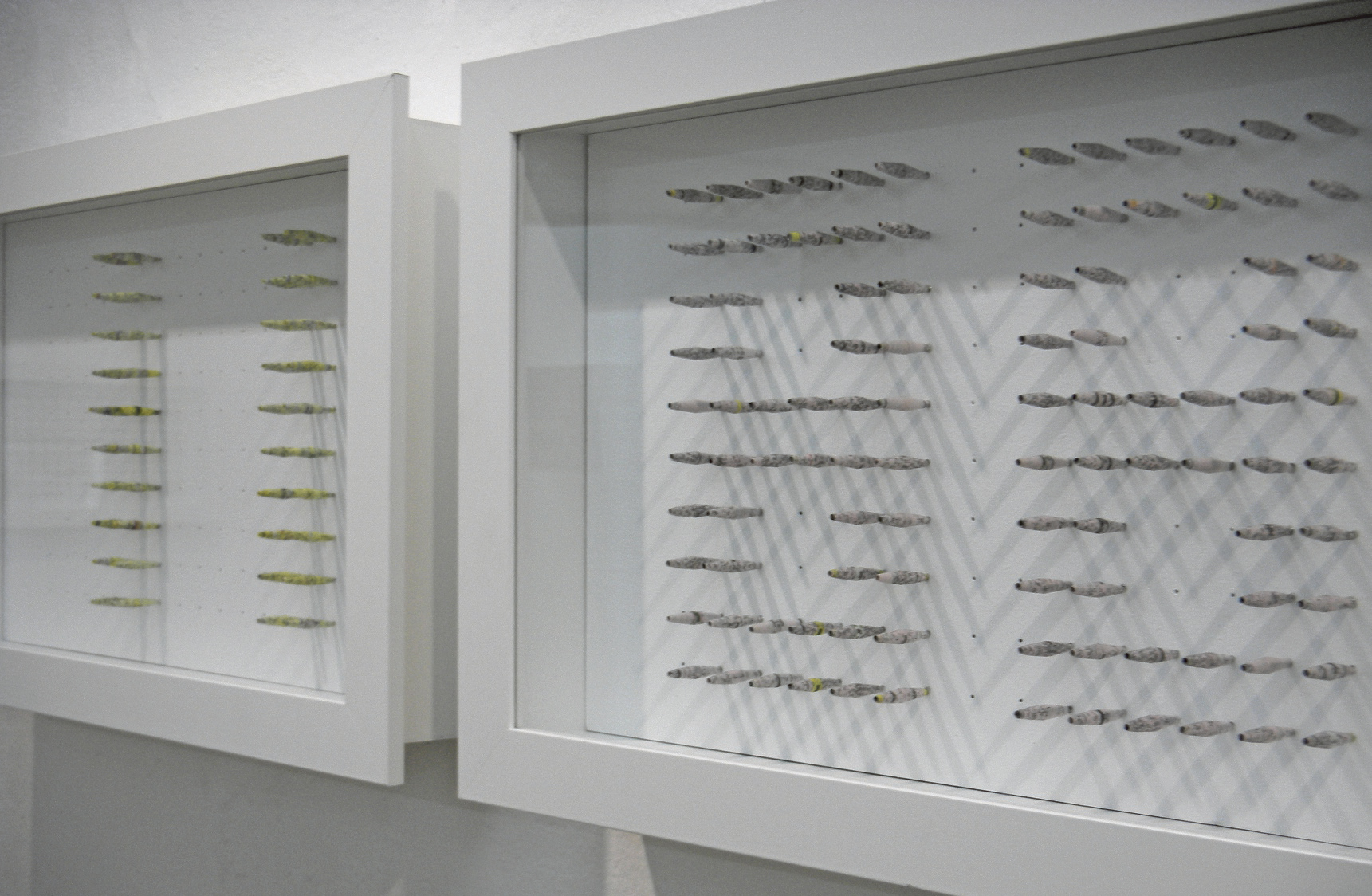 Während Edith Stauber ihren Blick auf Situationen und die damit einhergehende persönliche Erfahrung richtet, widmet sich Bibiana Weber den Dingen bzw. der Kommunikation mit den Dingen. In einem Zugang des Lost-and-Founds zeigte die Objektkünstlerin zwei Herangehensweisen – wobei sich die eine als eine Spur emotionaler erwies als die andere, die dem Sentiment die Ordnung beifügte. Kleine Wunderkammern aus gefundenen Objekten haben sich so angesammelt, etwa beim Spazierengehen; und ihre so entstandene Sammlung sei selbst „ein Kommen und Gehen“, sagt Weber. Sie weist in ihren Arbeiten auf Qualität(en) hin, gibt den Dingen Aufmerksamkeit, denn die Dinge „haben Spuren, haben Spuren hinterlassen, erzählen selbst Geschichten.“ Dass so Geschichten neu erzählt oder anders weitererzählt werden, ist selbstredend für den künstlerischen Prozess. Bibiana Weber sei dabei, so die Kolleginnen, „die Übersetzerin der Dinge“. Als vordergründig etwas weniger spielerisch (Weber arbeitet übrigens auch mit Stahl), erweist sich der zweite Ansatz Webers, der zum Beispiel in den Arbeiten Linz oder Telefonauskunft 11 88 77 zu sehen war. Dafür rollte sie aus dem Papier alter Stadtkarten, Zeitschriften, aus blauen Wahlkarten oder im Falle von „11 88 77“ aus dem Telefonbuch von ihr so bezeichnete Papierperlen. Dass diese Papierperlen, eine neben der anderen in Schaukästen aufgereiht, dabei nicht nur „je nach Lichtsituation Schatten werfen und Bewegung ins Spiel bringen“, sondern gewitzt wie grotesk Erinnerung zu verarbeiten und beinahe wissenschaftlich geordnet zu systematisieren scheinen, scheint dabei ganz klar Bezug auf die von ihr formulierte Absicht zu nehmen, „das Persönliche zu etwas allgemein Gültigerem zu transformieren“. Das Persönliche also fein säuberlich ausgeschnitten, quasi zu Erinnerungsperlen aufgewickelt und im Schaukasten platziert? Sozusagen eine gerollte Geschichte des Einzelnen und des Allgemeinen? Jedenfalls habe ich das Gefühl, dass die hier beispielhaft genannte Nummer der Telefonauskunft nicht nur über alte Zeiten und die neueren Zeiten der Digitalisierung spricht. Sondern ich entwickle so etwas wie einen kleineren Horror, dass die persönlichen Erinnerungen, jede für sich einzeln so schön durchlebt und deshalb für einen selbst so besonders wertvoll, irgendwann selbst wie tote Kleinstlebewesen in einem Schmetterlingskasten gleich, von einem selbst also aufwändig als Erinnerung präpariert, aufgerollt und platziert, zu einem System werden, das Bibiana Weber in ihrem Ausstellungstext so beschrieben hat: „Still ruhen diese Kleinstobjekte auf weißen, gerasterten Flächen in Objektkästen“. Bibiana Weber scheint in ihren Arbeiten jedenfalls eine beinahe wissenschaftliche, erkenntnistheoretisch anmutende Fragestellung platziert zu haben: Was ist den Dingen und was ist der Erinnerung immanent? Was kann man über den Kern der Dinge oder die Vergangenheit sicher wissen?