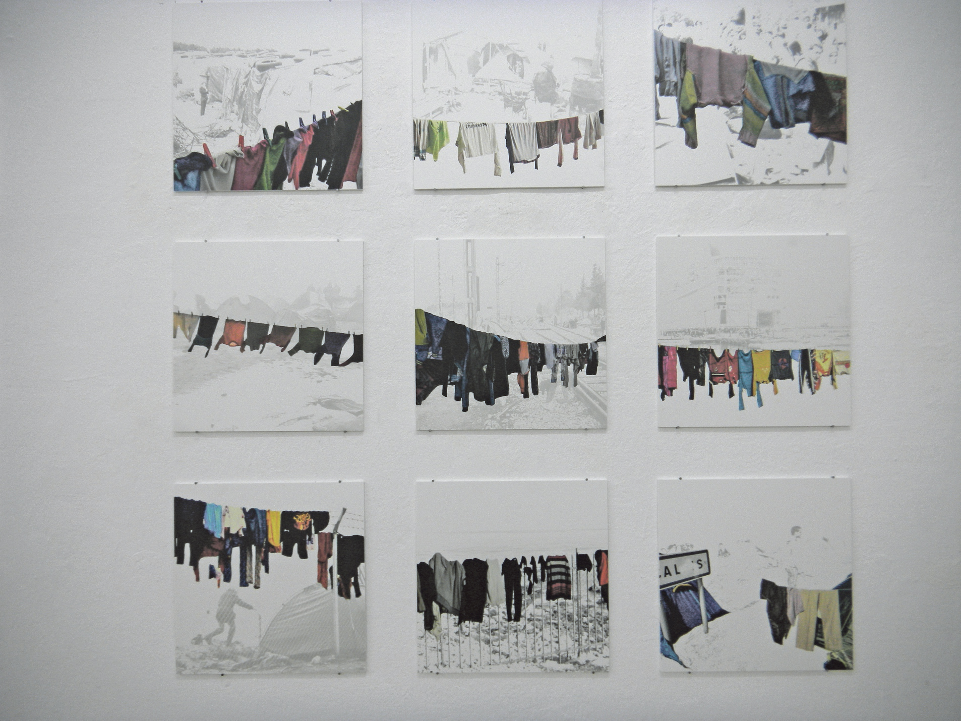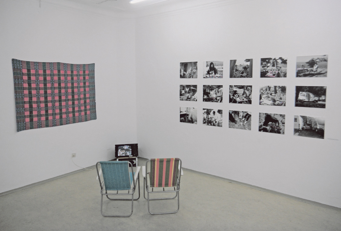 Im hinteren, letzten Raum hat Alenka Maly eine Rauminstallation aufgebaut, die aus mehreren Komponenten bestanden hat – und die als Gesamtsituation Anklänge von Reisen, Durchreisen, des insgesamt Unbeständigen evozierte; oder der großen Ungeheuerlichkeit des unkalkulierbar Improvisiertens eines jeden Lebens, das sich zuletzt und am Ende sozusagen immer als flüchtig erweist; und eines Raumes, in dem „großes Glück und großes Leid“ quasi miteinander leben, wie Alenka Maly angemerkt hat. So spürt man die in die Gegenwart strahlende Erinnerung an die Familie Malys – durch zwei im Raum einander gegenüberliegende installative Settings, die den letzten Campingurlaub mit dem Vater wieder auferstehen haben lassen. Die Erinnerungen erweisen sich als schön wie schmerzhaft. Ein Video zeigt den Vater und Musiker Gust Maly, im Süden auf einem Campingplatz Gitarre spielend. Er und die Familie wussten zu diesem Zeitpunkt bereits von seinem nahenden Tod. Die zum Loop geschnittene Melodie begleitet ein an die Wand gehängtes Tischtuch des Campingtisches, aufgehängt als Beleg des Gemeinsamen, als Ort, wo die Familie selbstverständlich zusammengekommen ist, um zu reden, zu essen, zu trinken und zu streiten – nicht zuletzt um die privaten sowie größeren Angelegenheiten einer an sich politischen Familie zu debattieren. Dieses Stück Tuch, das wie als Beweis des Gemeinsamen und gleichzeitig als Anklage des Verlustes gelesen werden kann, schlägt zudem eine andere Verbindung zu einem weiteren „Größeren“ im Ausstellungsraum auf: Gleichsam im persönlichen Leid verankert, scheint Maly das Wissen um den Schmerz zu multiplizieren, transformiert persönlichen Schmerz und Mitgefühl mit den vielen Familien und Menschen auf der Flucht. In Wäsche bearbeitete sie Pressefotos aus den Flüchtlingscamps, indem sie etwa diese Bilder verblassen ließ, um Wäschestücken auf Wäscheleinen wieder Farbe einzuhauchen, inklusive kleiner Maschen und Schleifen auf kleinen Mädchenpullovern: Wäsche als bereits des Öfteren von Maly gewähltes Mittel, als Symbol für das der Haut am nähesten Liegende; als Symbol für Nähe, die sich mitfühlend mit dem Leid anderer zu verbinden weiß, in einer zutiefst humanistischen Positionierung. Nach dem Verlassen der Räume klingt die Melodie des Vaters noch lange nach.