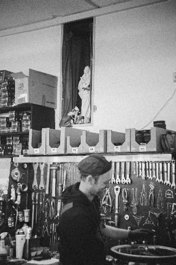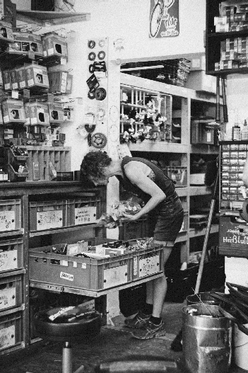 RE: Wir haben Max mit einem Fahrradmechaniker-WIFI-Kurs, weil es bis vor zwei Jahren gar keine Möglichkeit für eine Lehre in diesem Bereich gegeben hat, und Gerald mit einer Fahrradmechatroniker-Lehre. Die anderen Teile unseres Kollektivs sind Autodidakten. Und nicht zu vergessen unseren Lehrling Veronika. Sie macht die Ausbildung von der Pike auf.